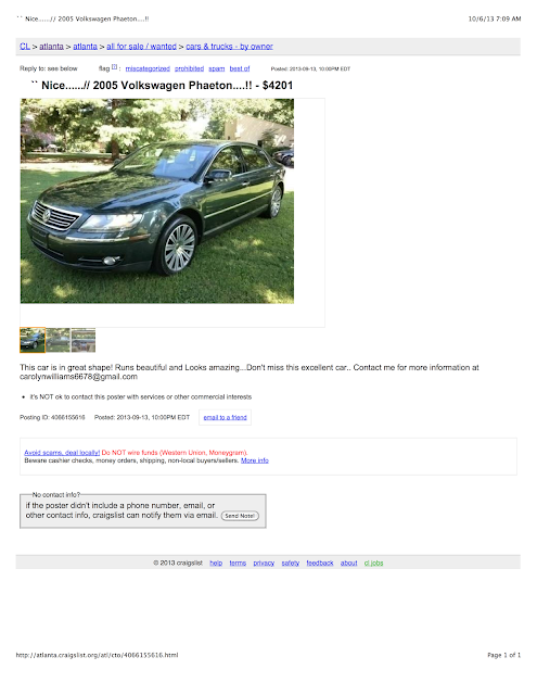 The same person who posted the this scam Mini Ad is now doing the same with a VW Phaeton; So Far I have found the car being advertised on Craigslist in 5 States. Here's the active ad as of 10/6/2013: